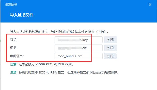一、群晖 SSL 导入位置控制面板→安全性→证书二、新增证书新增证书后可选,新增或替换证书(替换就是更新已过期的证书)三、导入证书替换证书选导入即可下一步 重点来了,导入已下载的证书文件,由于记不住,特截图留存,以儆效you;四、总结 正确下载 Apache 版本的证书, Nginx 的屡试不行;友情提示:个人记录,禁止转载。